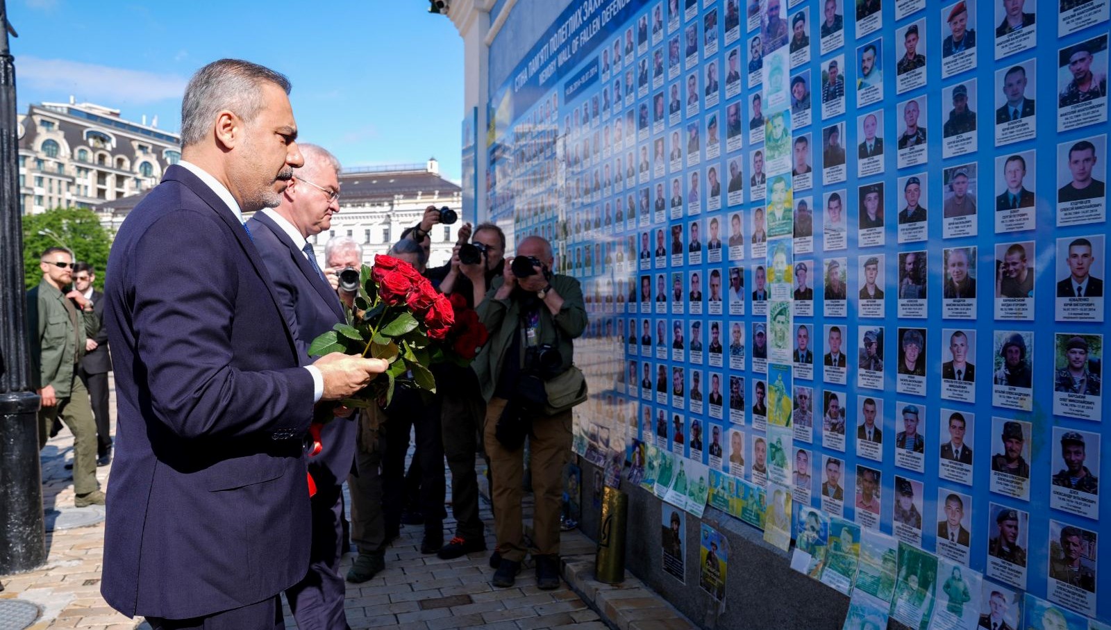 Bakan Fidan, daha sonra akınlarda hayatını kaybeden Ukrayna askerleri anısına oluşturulan Anma Duvarı’na çiçek bıraktı. Bakan Fidan’ı anma töreninin yapılacağı alanda Ukrayna Dışişleri Bakanı Andrii Sybiha karşıladı.