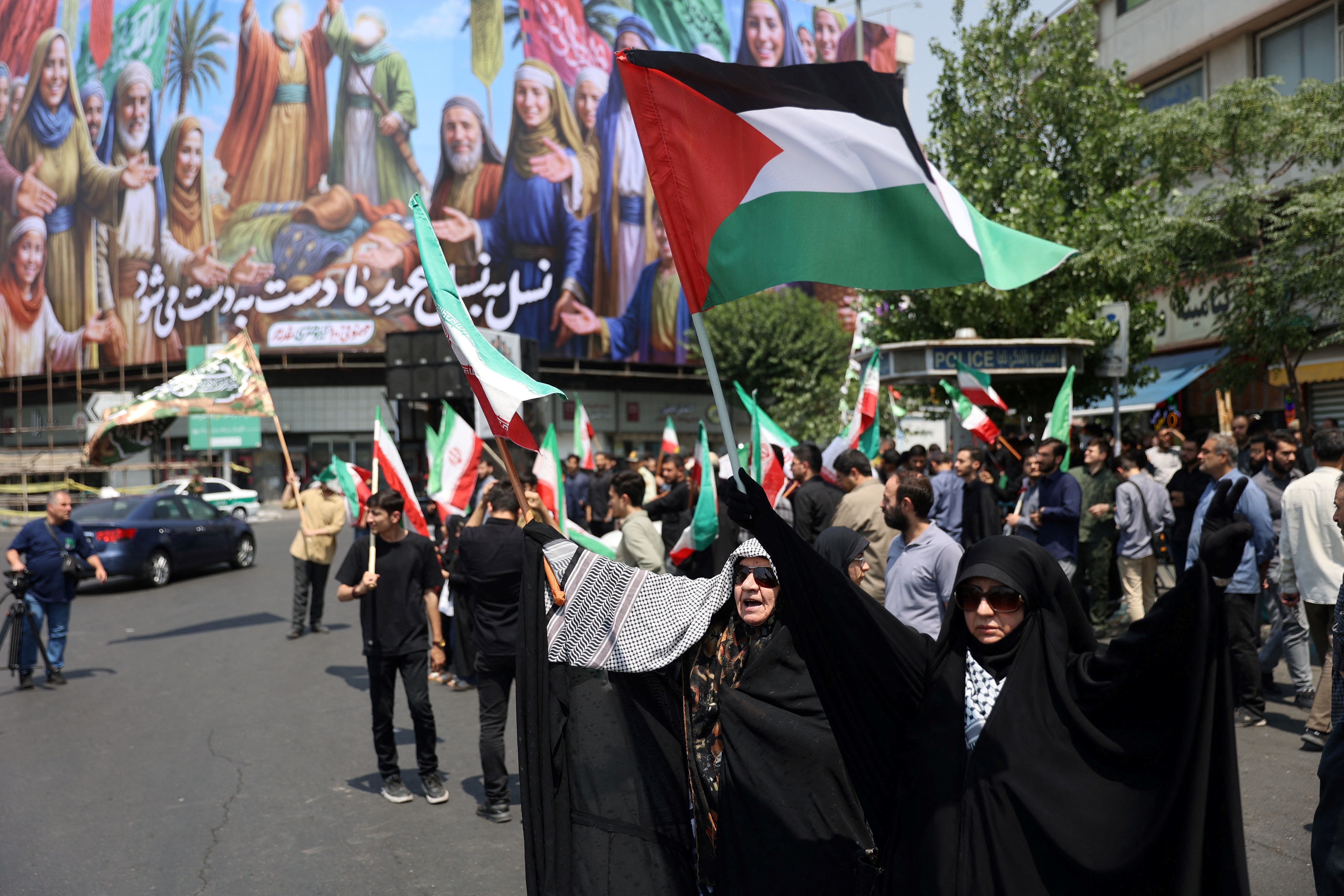 Tahran’da toplanan İranlılar, İran bayraklarının yanı sıra İsrail’in işgal ve akınları altındaki Filistin’in bayraklarını da açtı.
