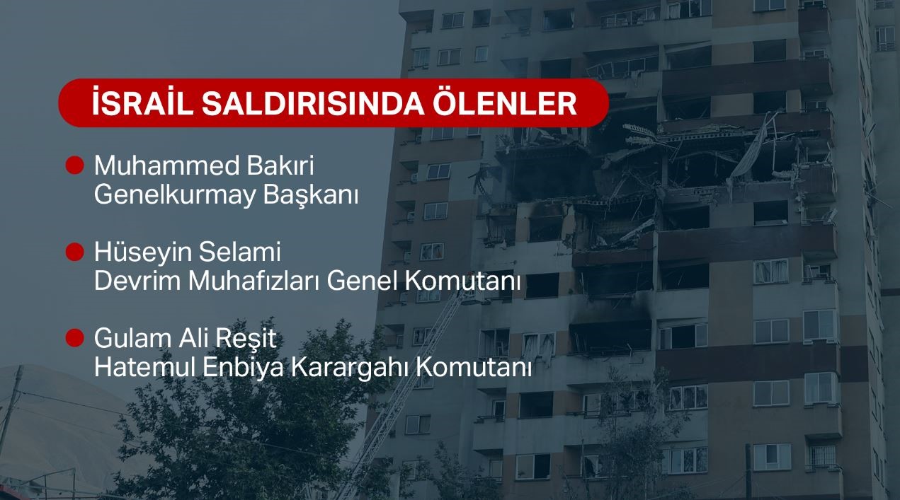 İsrail’in İran çapında düzenlediği saldırılarda İran Genelkurmay Başkanı Tümgeneral Muhammed Bakıri, İhtilal Muhafızları Genel Kumandanı Tümgeneral Hüseyin Selami dahil üst seviye askeri yetkililer ile altı nükleer bilim insanı hayatını kaybetti.
