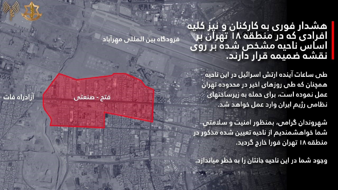İsrail Ordusu Sözcüsü Avichay Adraee, toplumsal medya hesabından Tahran’ın bir bölgesinin kırmızı renkle işaretlendiği bir harita yayınladı.