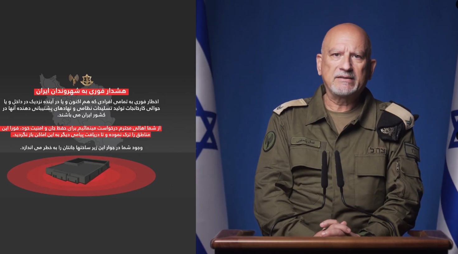 İsrail ordu sözcüsü, toplumsal medya platformu X üzerinden yaptığı paylaşımda, nükleer reaktörlerin ve silah depolarının bulunduğu bölgede yaşayan İranlılar için tahliye uyarısı yayınladı.