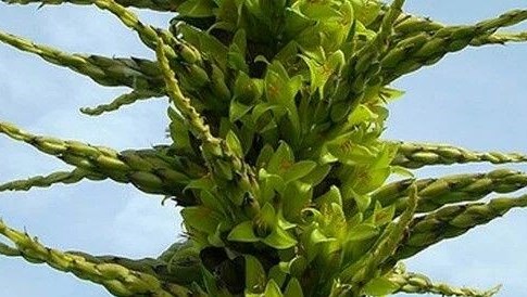 Yaklaşık 3 metre uzunluğunda (10 fit) çiçek sapı çıkaran bitkinin sarı-yeşil çiçekleri çarşamba günü açtı. Bu olağan dışı gelişme, okulun bahçıvanı Louise Moreton tarafından hem heyecan verici hem de iklim değişikliğinin korku verici bir işareti olarak yorumlandı.