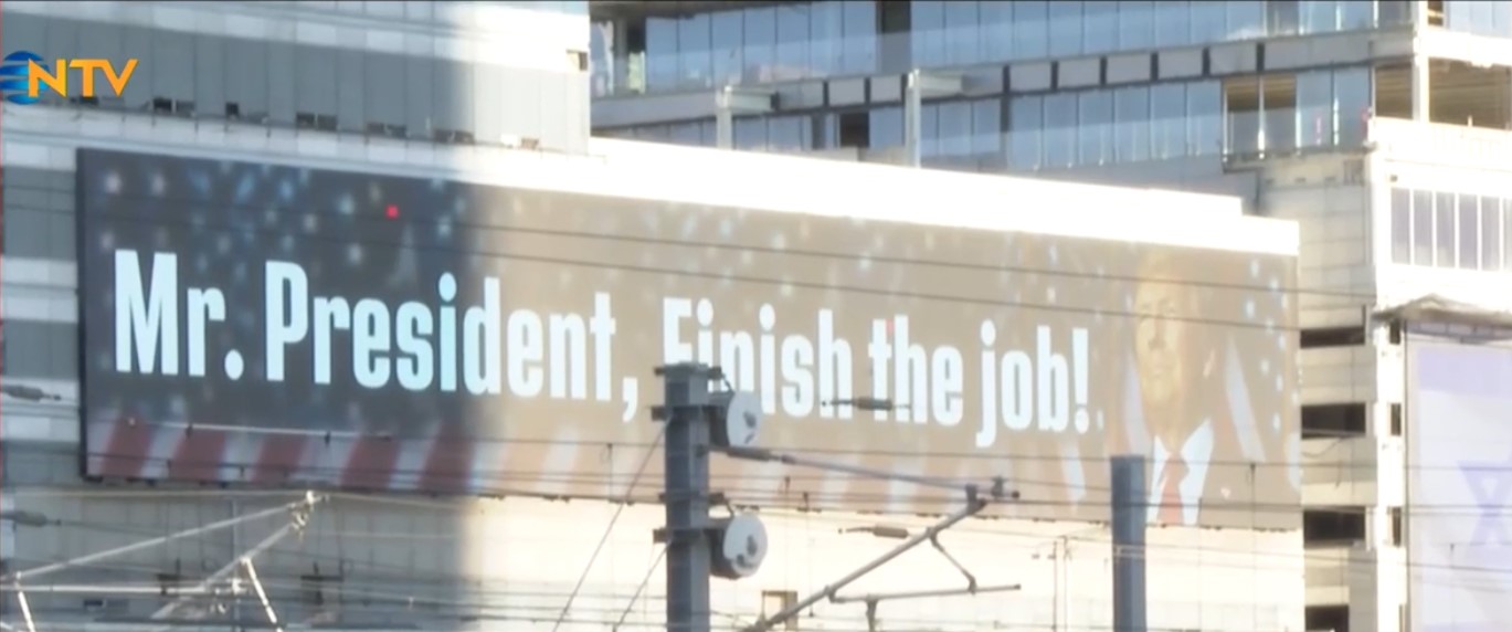 Binanın üzerindeki reklam panosunda, ABD Başkanı Donald Trump’ın bir fotoğrafı görülürken, çabucak yanında da “Mr. President, Finish the job! (Bay Lider işi bitirin) sözü yer alıyor.